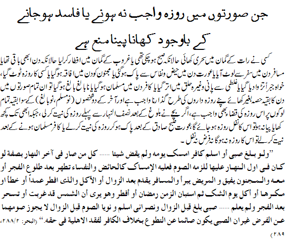 جن صورتوں میں روزہ واجب نہ ہونے یا فاسد ہو جانے کے باوجود کھانا پینا منع ہے