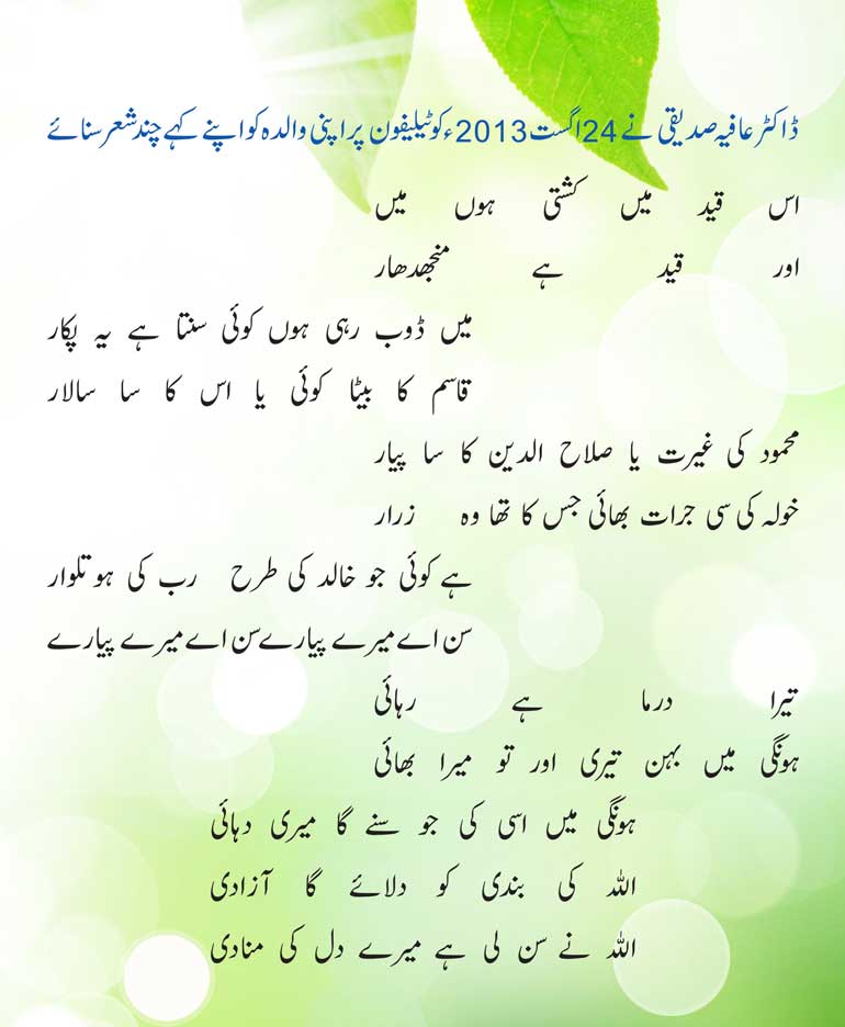 ڈاکٹر عافیہ صدیقی صاحبہ کے چند اشعار